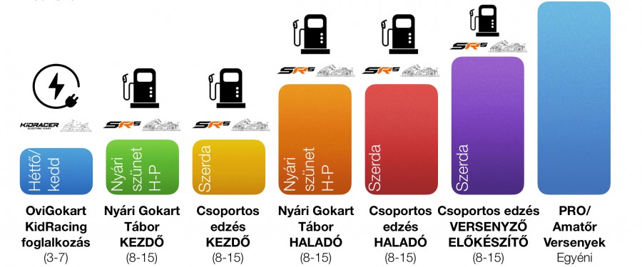 A programra jelentkezőket életkor és tapasztalat szerint osztjuk be. Kezdők és “kicsik” OviGokart csoportjai 25% motorteljesítménnyel, egyszerűbb, játékosabb feladatokat teljesítenek, míg a KIDRACING-esek 90% motorteljesítménnyel már a sulisok feladataihoz hasonló gyakorlatokban vezetnek, felkészítve őket a benzines “felnőtt” gokartok használatára.
